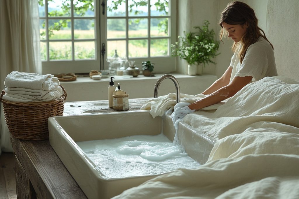 Dans certains cas, un lavage en machine n’est pas toujours la meilleure option. Pour les housses de couette particulièrement délicates ou fragiles, envisagez un lavage à la main. Utilisez alors une lessive douce dissoute dans beaucoup d’eau, et évitez de trop frotter.