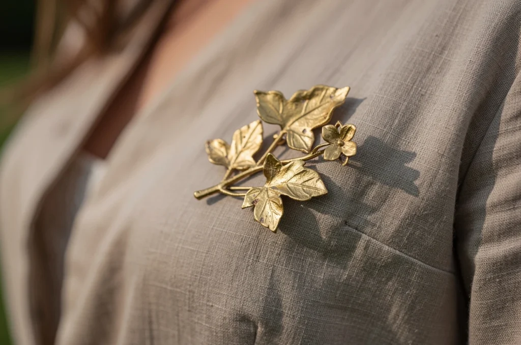 Privilégier des broches dorées travaillées autour de lignes simples garantit un rendu élégant, sans effet “trop chargé”. Ces motifs inspirés de la nature font écho à la mode écoresponsable et valorisent un savoir-faire artisanal.
